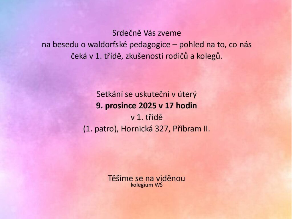 9. prosince | 17 hodin | Beseda o waldorfské pedagogice se zájemci o zápis dítěte do 1. třídy naší školy | Hornická 327, 1. patro, 1. třída